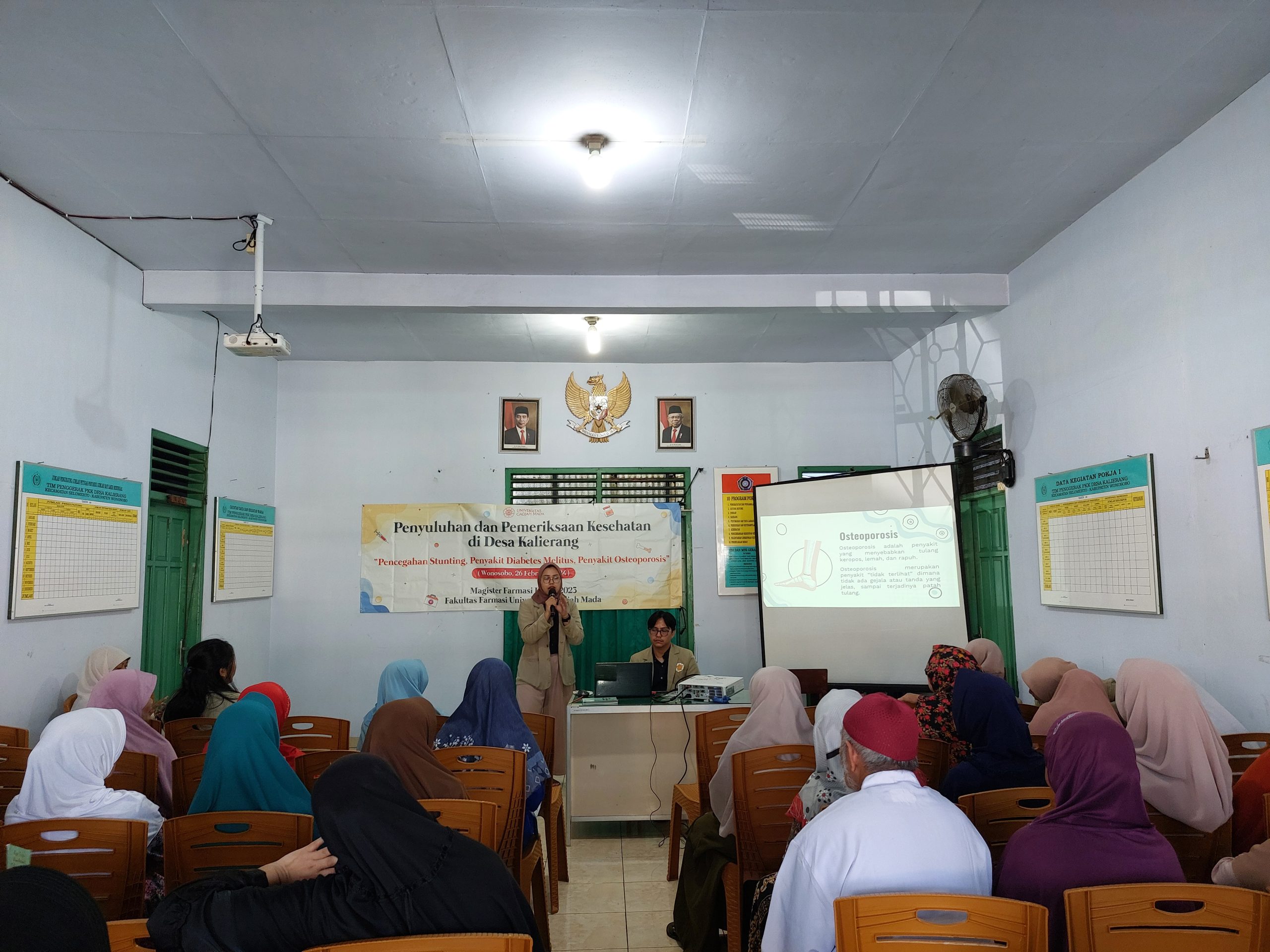 Salah satu kegiatan yang wajib dan rutin dilakukan oleh Fakultas Farmasi Universitas Gadjah Mada adalah pengabdian masyarakat. Tiap tahun, mahasiswa bersama dosen dan tenaga pendidik mengusung tema yang bervariasi dan dikemas dengan cara yang beragam pula. Salah satu kelompok mahasiswa Magister Farmasi Klinik (MFK UGM) tahun ini mengusung tema “JAKET (Jaga Kesehatan Tulang) : Osteoporosis” dimana kegiatan ini dilakukan di Kantor Desa Kalierang, Kecamatan Selomerto, Kabupaten Wonosobo, Jawa Tengah. Adapun target audiens pada pengabdian masyarakat kali ini adalah kelompok lansia yang notabene merupakan salah satu populasi dengan populasi terbanyak mengalami osteoporosis.