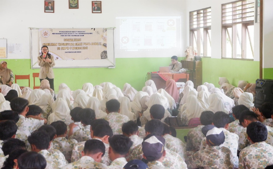 Mahasiswa Magister Farmasi Klinik UGM Angkatan 2023 melaksanakan kegiatan pengabdian masyarakat sebagai salah satu perwujudan nilai UGM kepada masyarakat untuk terus bertumbuh dan berkembang menjadi lebih baik sehingga dapat berguna bagi masyarakat. Kegiatan ini mengusung tema “Sosialisasi Pemilihan Kosmetika Aman pada Remaja di Wonosobo”. Acara ini dilaksanakan pada tanggal 24 Februari 2024 di ruang kelas SMPN 4 Wonosobo pukul 09.30 wib. Kegiatan ini juga dihadiri oleh Ketua Program Studi Magister Farmasi Klinik UGM yaitu Dr. apt. Fita Rahmawati, Sp. FRS, Dosen Pembimbing Pengadian Masyarakat yaitu drh. Retno Murwanti, M.P., Ph.D, Kepala Sekolah SMPN 4 Wonosobo, Siswa-Siswi SMPN 4 Wonosobo, Bapak dan Ibu Guru SMPN 4 Wonosobo. Kegiatan pengabdian masyarakat ini secara khusus bertujuan untuk memberikan pengenalan mengenai kosmetik yang aman digunakan, pemahaman tentang bahaya penggunaan kosmetik dengan kandungan bahan yang tidak sesuai standar, serta pelatihan dan keterampilan tentang cara memilih kosmetik yang aman dan legal berdasarkan produk produk yang sudah terdaftar pada Badan POM. Sehingga, harapannya penyuluhan ini dapat memberikan manfaat yang akan dirasakan bagi para siswa-siswi, pihak institusi dan masyarakat dalam memilih produk yang aman dan efektif.