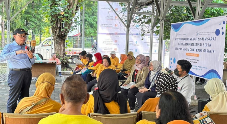 dian masyarakat dengan topik utama Penyuluhan Penyakit Sistem Saraf Pusat dan Gastrointestinal serta Aturan Minum Obat pada Geriatri yang merupakan salah satu populasi yang memiliki risiko lebih tinggi terhadap kejadian stroke. Penyakit stroke merupakan salah satu penyakit yang menyumbang nilai morbiditas dan mortalitas tinggi sehingga perlu dilakukan upaya pencegahan dan peningkatan kesadaran masyarakat terkait kejadian stroke, khususnya Geriatri. Pengabdian masyarakat ini diselenggarakan oleh Fakultas Farmasi UGM pada tanggal 20 November 2024 berhasil dilaksanakan dengan melibatkan kolaborasi aktif antara apt. Putu Wida Kawistari, S.Farm., apt. Annisa Nur Kharisma, S.Farm., apt. Melisa Rezki Puspitasari, S.Farm., apt. Salma Nur Azizah Azzahra, S.Farm., apt. Megasukma Muduri Armala, S.Farm. selaku mahasiswa Magister Farmasi Klinik Fakultas Farmasi UGM 2024, Prof. Dr. apt. Agung Endro Nugroho, M.Si., Prof. Dr. dr. Ismail Setyopranoto, Sp.S(K), dan apt. Firdhani Satia Primasari, M.Clin.Pharm. sebagai dosen pembimbing, Dr. dr. Paryono, Sp.N, Subsp. NIOO(K) sebagai Dokter Spesialis Neurologi dan narasumber pada penyuluhan ini, serta tenaga kesehatan di Klinik Dokter Keluarga Korpagama UGM, Yogyakarta.